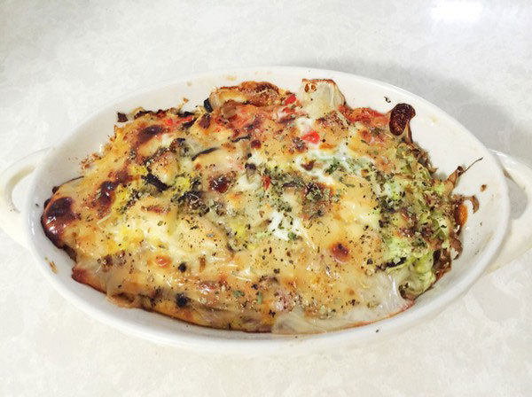 4:按照个人喜好在燕麦奶液上面铺上各色蔬菜,放入烤箱中,180度,烤15-20分钟即可