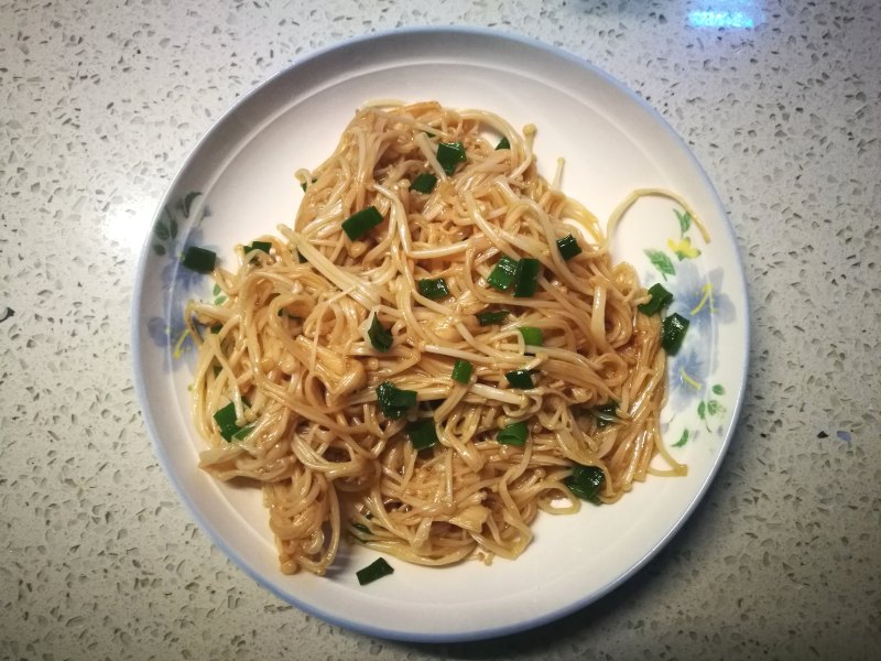 7:把金针菇控干水分放入大碗里,倒入煸好的葱油,放少许盐搅拌均匀即可食用。