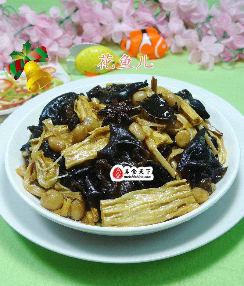 1:食材:腐竹(已泡软清洗切段)、黑木耳(已泡发清洗)、黄花菜(已泡发清洗)、花生米(已煮熟)、桂皮、大料