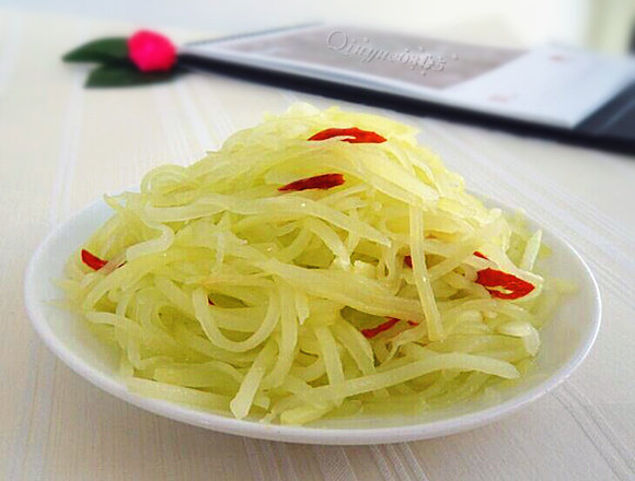 7:花椒辣椒油浇到莴笋丝上,放一点醋、味精、香油等调味品。
