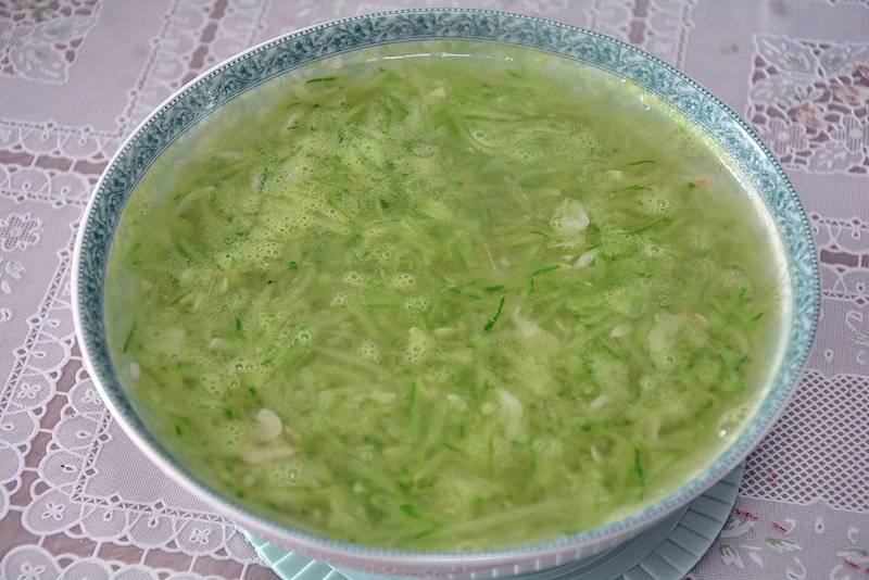 4:加入丝瓜块小火慢熬,起锅前加入盐。