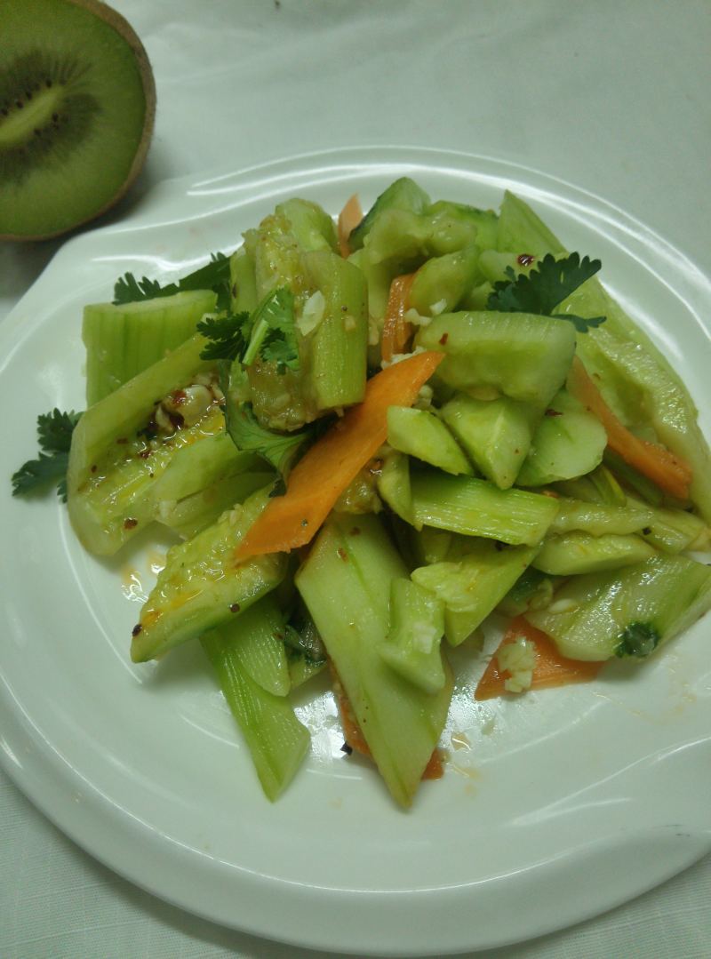 4:黄瓜去皮,拍松切段,胡萝卜切成菱形片,香菜切断,蒜切成蒜沫