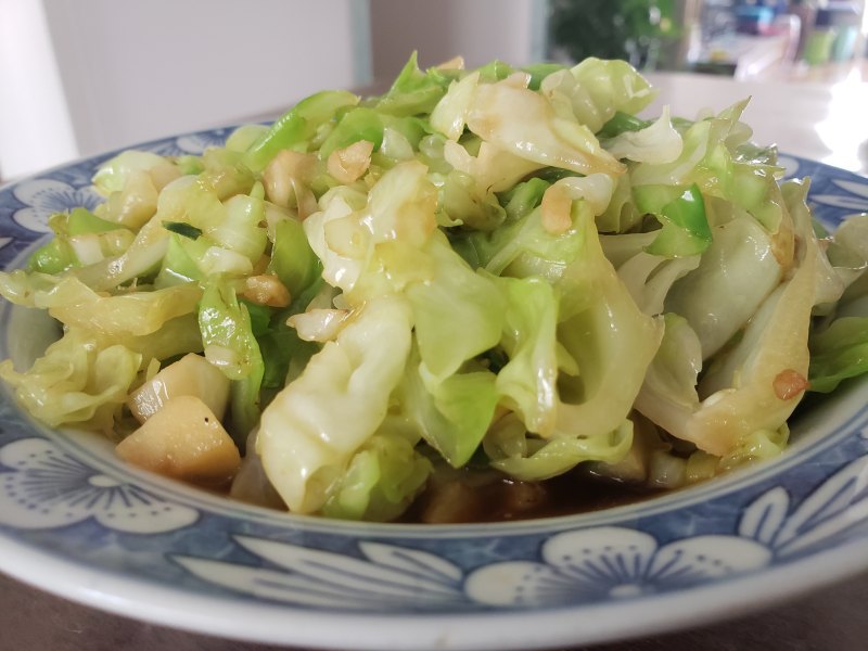 4:锅烧热倒入花生油,再倒入蒜爆香,继续倒入包菜,快速翻炒,待2分钟翻炒至包菜变软,放盐和生抽调味,翻炒均匀即可。