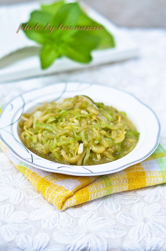 1:丝瓜去皮,切断,然后用小勺挖出丝瓜的瓤。
