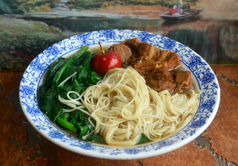 9:捞出面条,放入红烧肉,蛋皮丝,葱丝,浇一勺肉汤即可。
