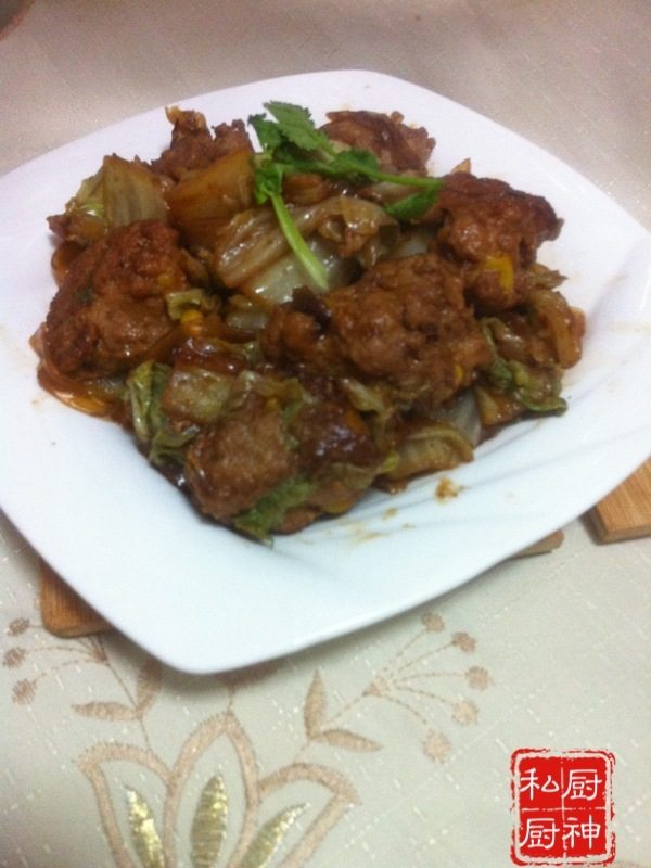 4:放狮子头煎2分钟,然后放入白菜炒1分钟,烹入生抽,料酒,蚝油,白糖,大火烧开,烧5分钟,白菜入味即可。