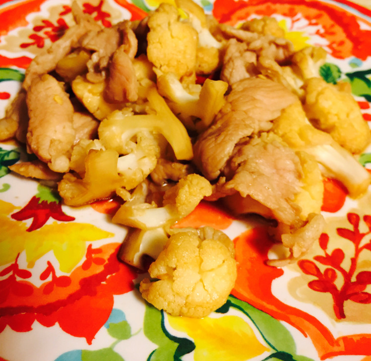 5:用中火炒到看到猪肉变色和菜花上色之后就可以起锅啦~