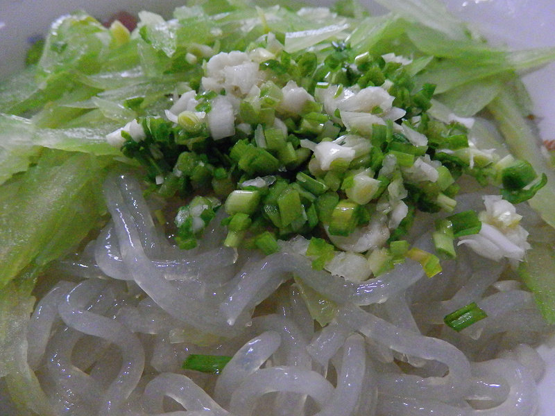 9:撒上青蒜碎,加入生抽、醋、盐、芝麻油调味,搅拌均匀即可上桌。