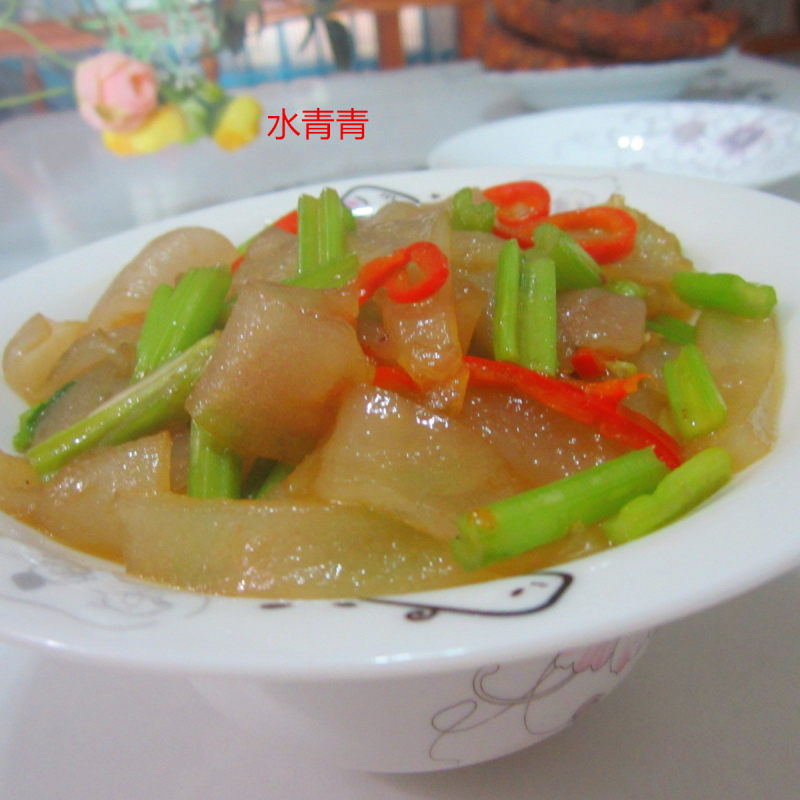 2:西瓜皮切成条加少许盐搅拌均匀腌制10分钟,杀杀水分。