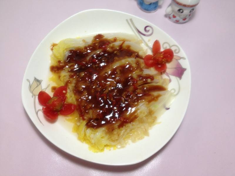 5:把白菜摆盘后,把黄金蒜加少许水和盐浇上去,如图