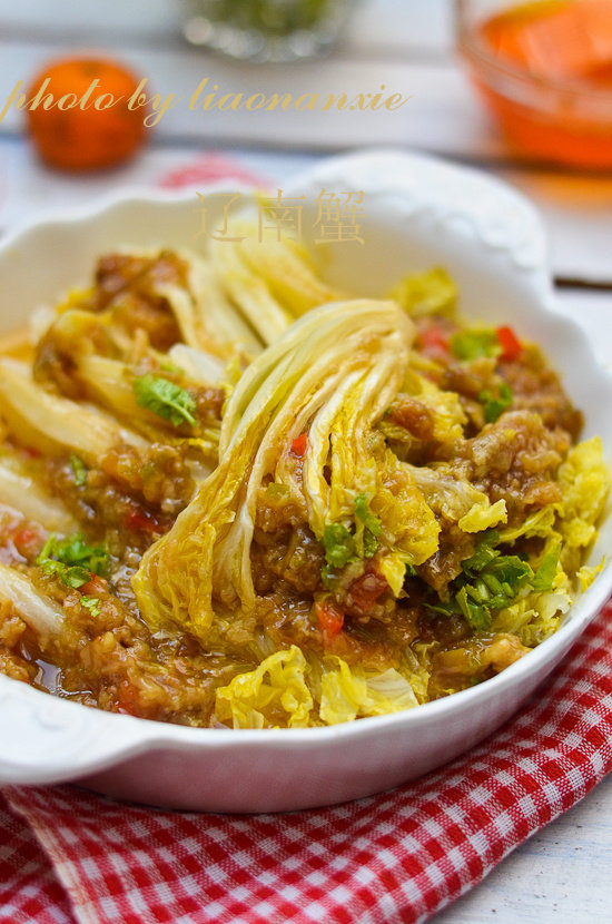 7:7、将炒好的小料铺在白菜上,上锅蒸十二分钟,出锅淋花椒油辣椒油,点缀香菜即可。