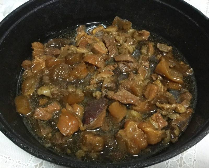 4:调料均匀分布在肉锅中,盖上锅盖,小火慢炖1小时