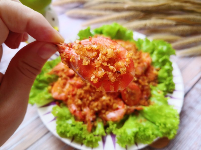 5:起锅烧油,用小火炒香姜蒜末,然后放面包糠炒至变色,接着放虾、盐、糖翻炒均匀,撒上蒜花即可出锅装盘。