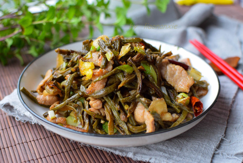 干豆角的可塑性非常强,把腊肉换成腊肠也非常好吃。干豆角是夏季的鲜豆角蒸熟之后晒干得到的,口感非常好,味道也很香。还有一道经典的湘式腊味小炒萝卜干炒腊肉,所用的萝卜干也属于干菜,可以直接买成品,也可以在初冬的时候把萝卜切成片或者切成条直接晒干保存,吃时需要煮熟。