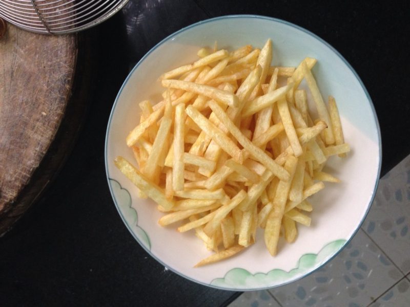 7:炸薯条时最好一次不要放入过多,将薯条炸至金黄出锅。无需再加盐因为已经用盐水侵泡过。
