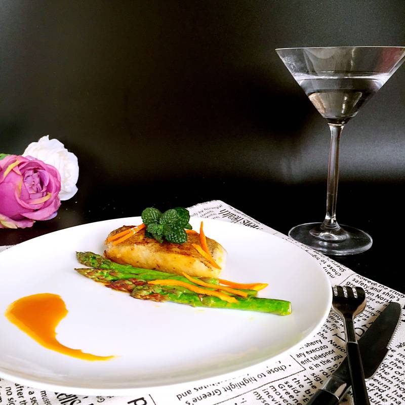 银鳕鱼2块;芦笋9根;橙汁100ml;