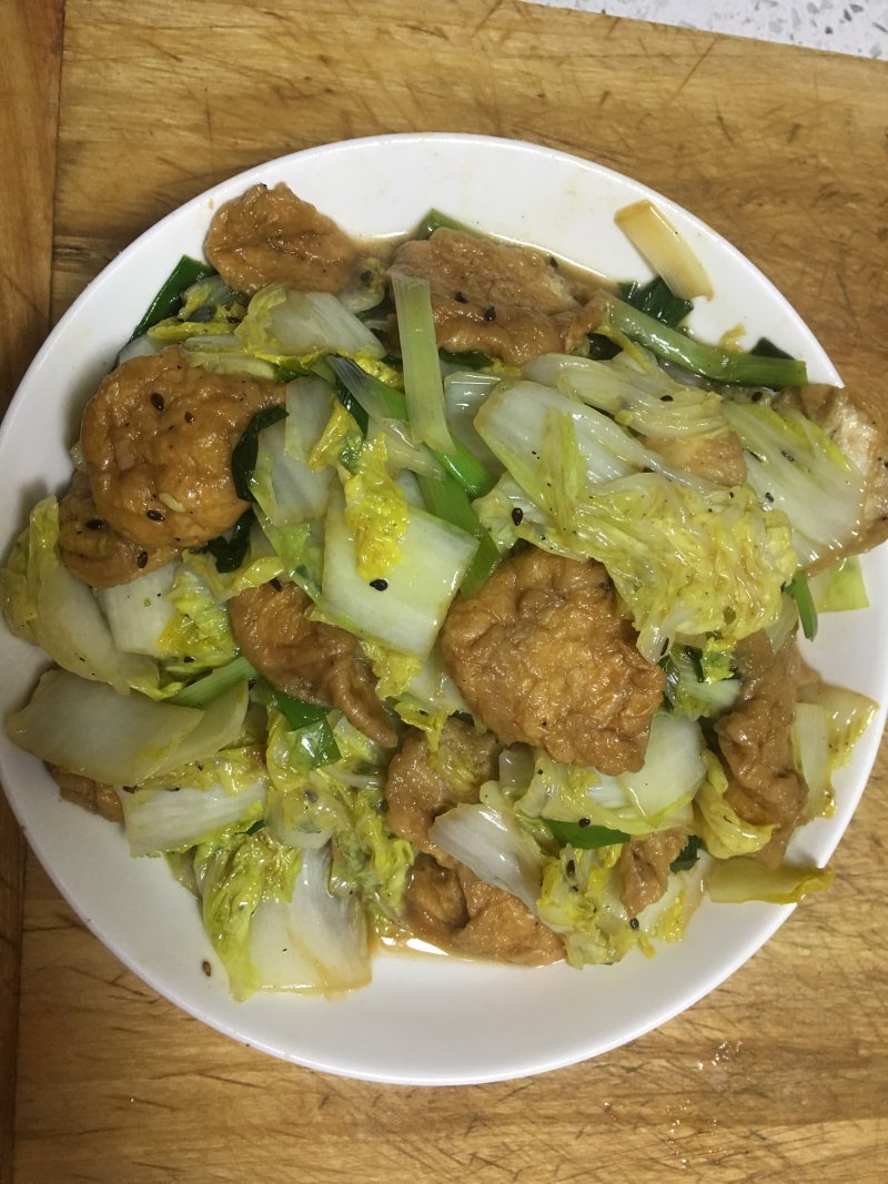 5:再将切好的娃娃菜放入锅里,加入生抽提色,娃娃菜和豆泡烧至熟透;