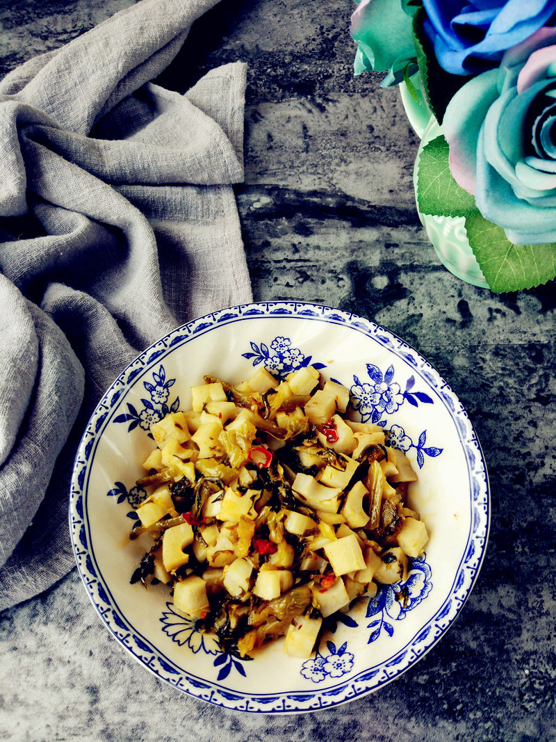 4:酸菜切好后在锅中干煸,去除土腥味,炒好后盛出备用。