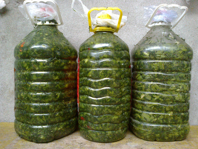 6:家里用空的油壶此使可派上用场,把揉好的雪菜往里面放,油壶口很小不好放,所以用上筷子来帮忙。