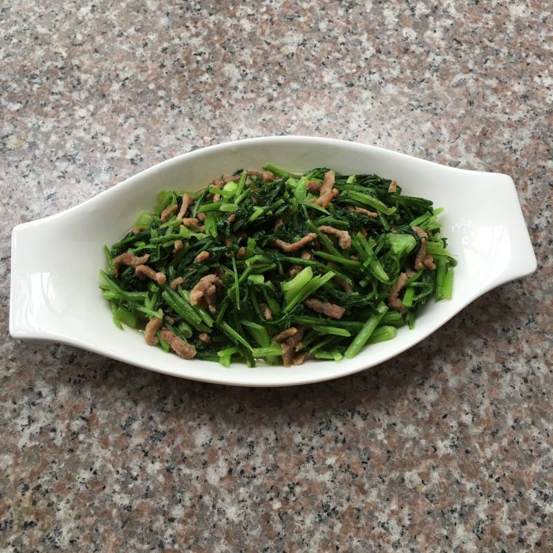 4:锅里热油炒香肉丝加入雪里红翻炒一下加盐和鸡精调味即可