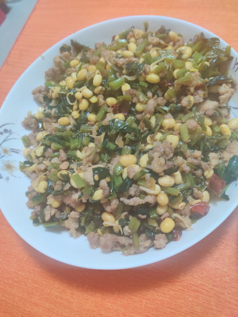 雪里红一颗;肉末适量;黄豆一块钱的;