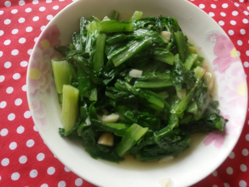 5:蒜米煸香后倒入切好的油麦菜翻炒