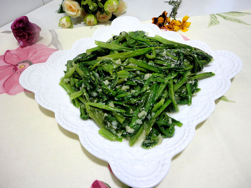 5:蒜末微微变黄后加入胡萝卜炒至短生后加入油麦菜,改大火爆炒至8分熟加适量盐,少许酱油(只为提鲜)