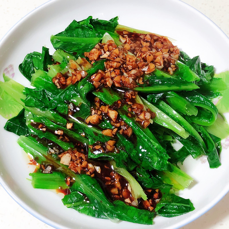 4:少油把蒜米爆香,加入蚝油、生抽、辣油拌均。