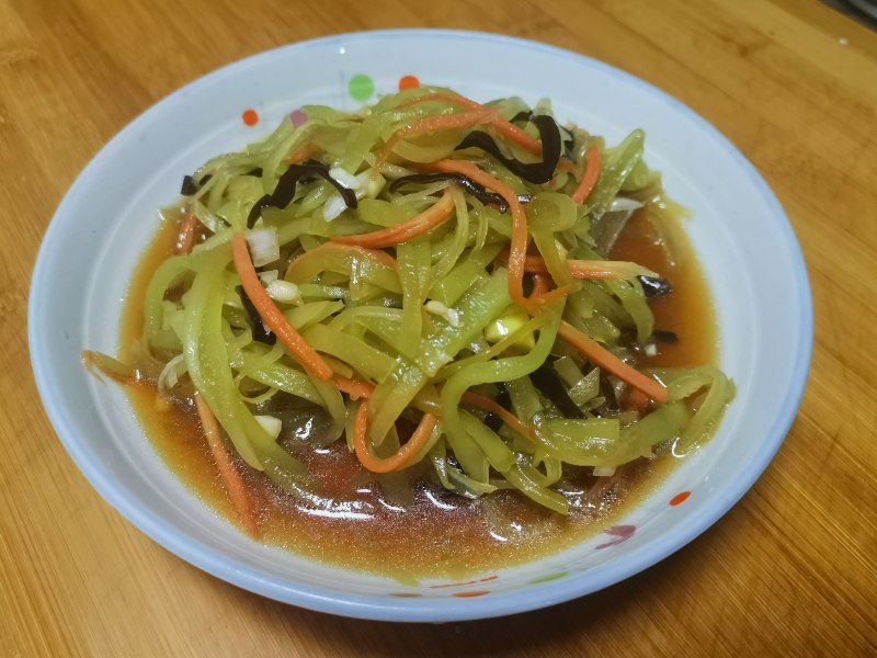 2:莴笋切丝,越细越入味,(请忽略我的刀工)切好的丝用清水泡十分钟。