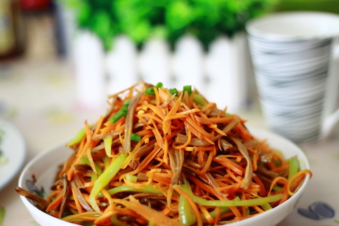 4:锅中加适量油,倒入红萝卜丝翻炒几下
