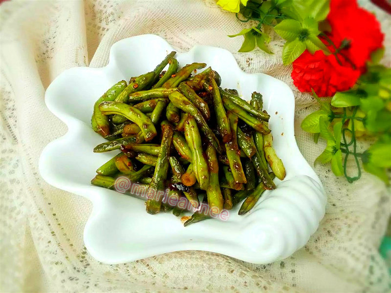 1:将四季豆洗净并去掉头尾和两侧的老筋,掰成长约3厘米的小段待用;干辣椒用湿布擦干净表面灰尘再剪成小圈