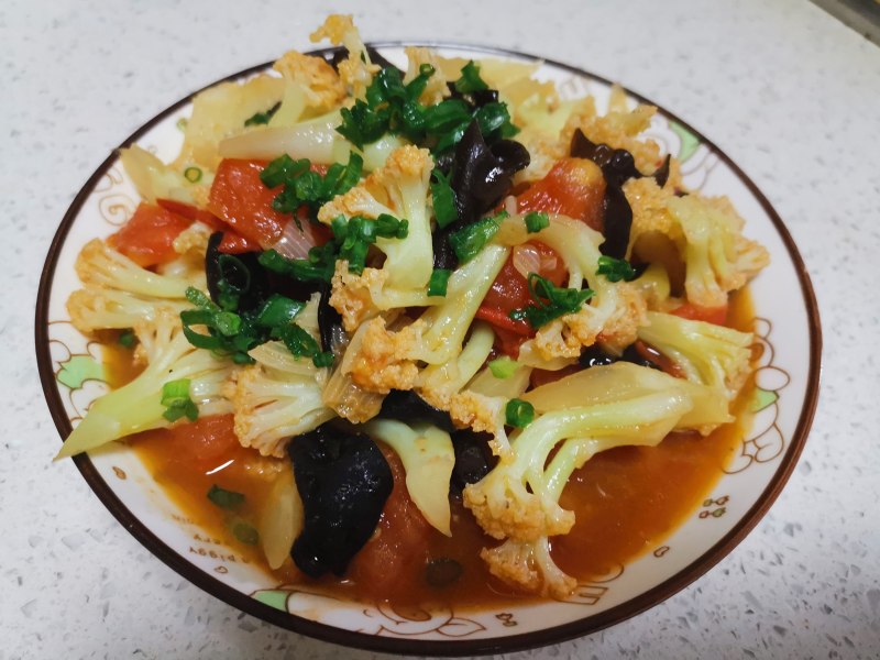 1:西红柿切块,菜花掰开,焯水一分钟捞出过凉水,这样炒起来省时间,木耳提前泡好,葱姜蒜切碎。