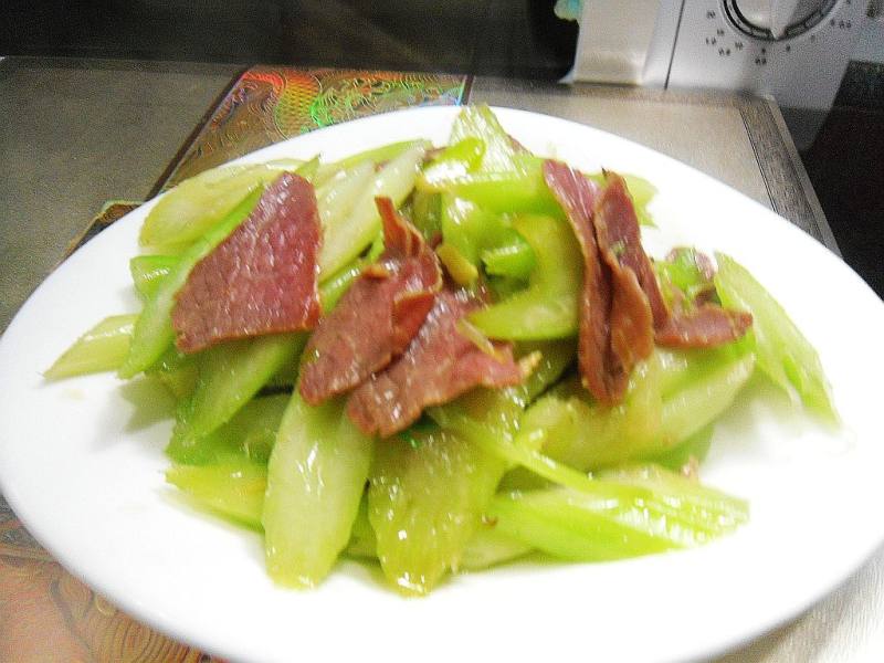 7:由于芹菜已经焯过水了,本身就已经七成熟可以直接食用了,下锅和火腿翻炒均匀后加入适量食盐调味即可。还可以根据个人口味加入鸡精麻油之类的调料让口感更丰富一些。