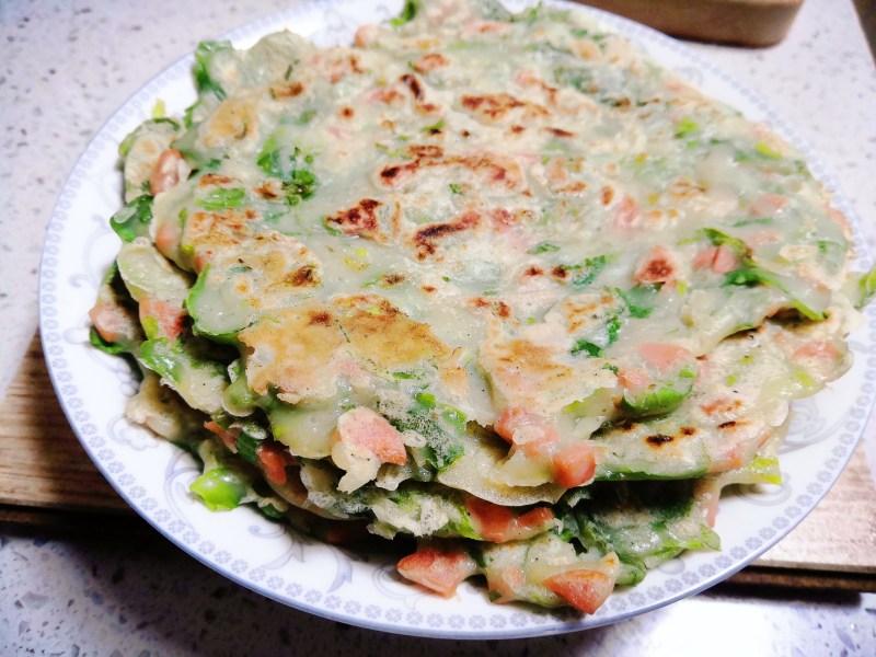 芹菜叶适量;面粉适量;鸡蛋适量;火腿肠适量;