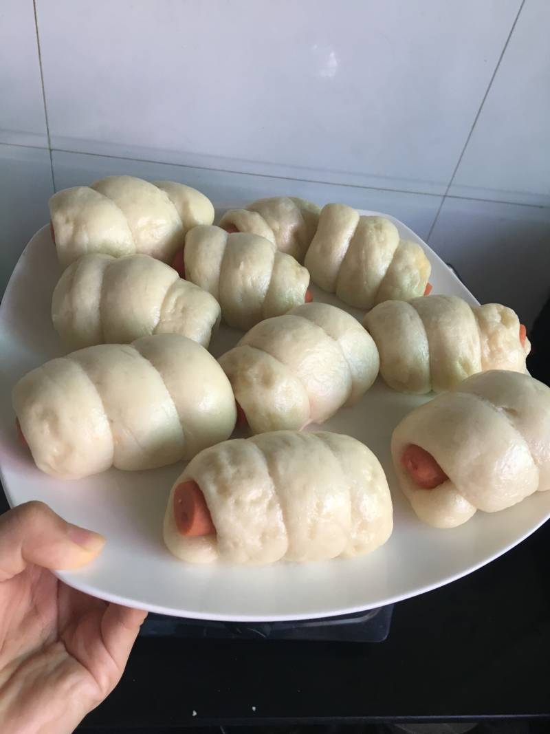 2:火腿肠对半切开,面团发好揉好,切成小剂子,搓成长条,大约2.5倍火腿肠长度,裹在火腿肠上。