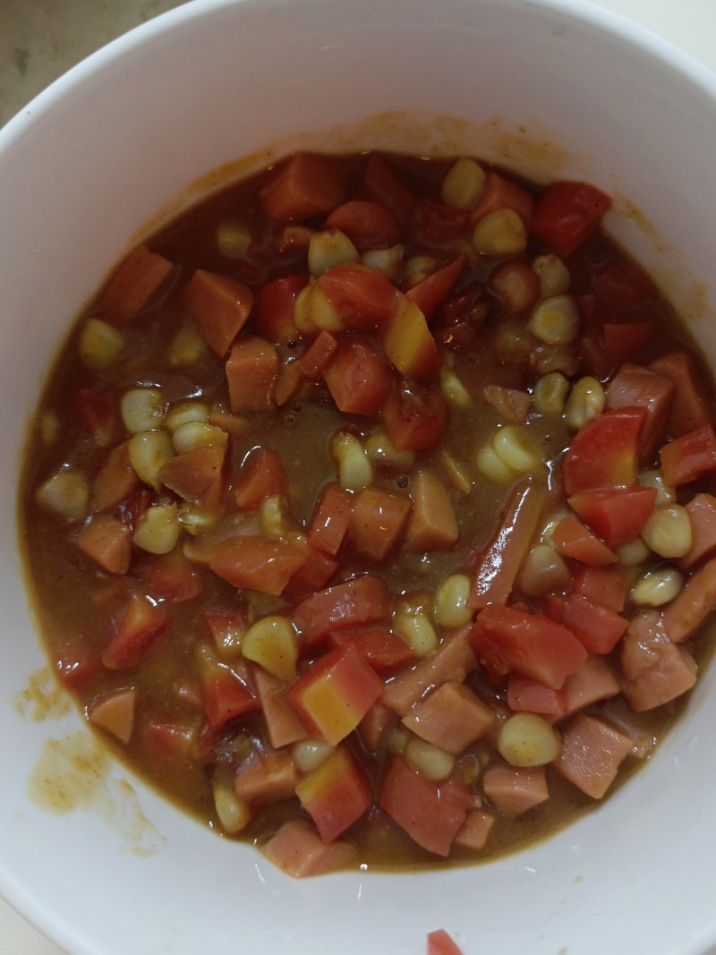 1:油热以后,放入切成小丁的胡萝卜和火腿肠丁翻炒变色。
