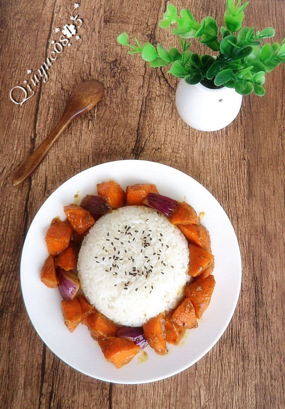 11:来一碗米饭,把做好的胡萝卜咖喱浇在上面即可。