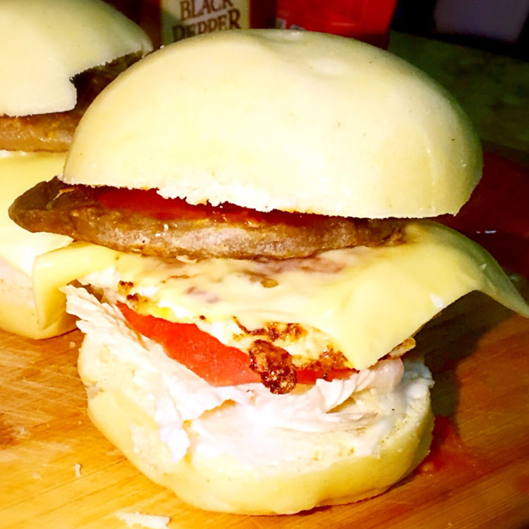 6:馒头两半一半抹色拉酱,一半抹黄豆酱。然后平均码放蔬菜,煎蛋,芝士,肉排,这样的顺序便于用煎蛋和肉排的热度融化芝士片。口感比较好。最后在肉排上涂上番茄酱。