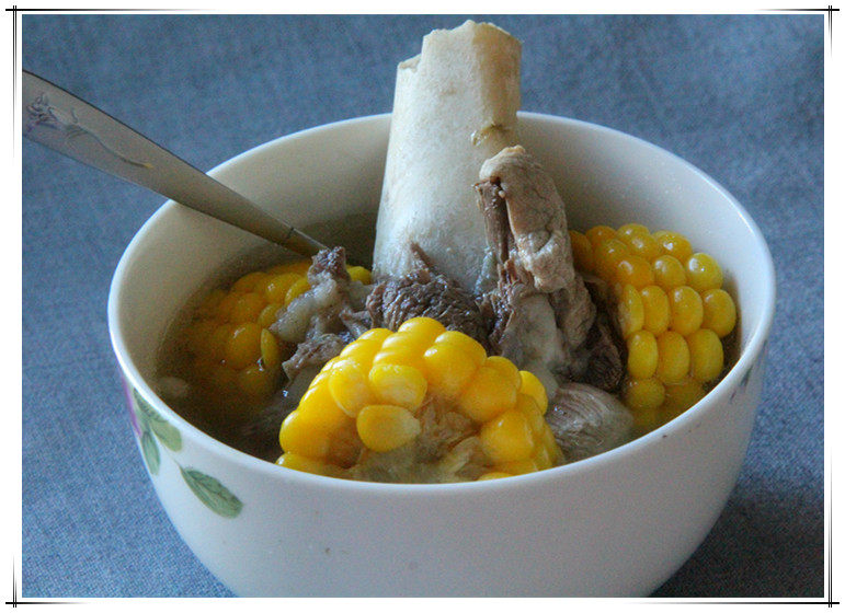 4:骨头煮得差不多可以嚼时,放入切好的玉米,加点盐,继续煮。