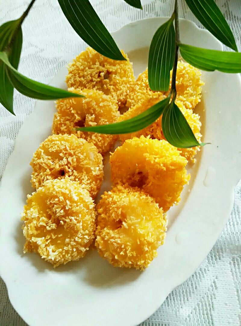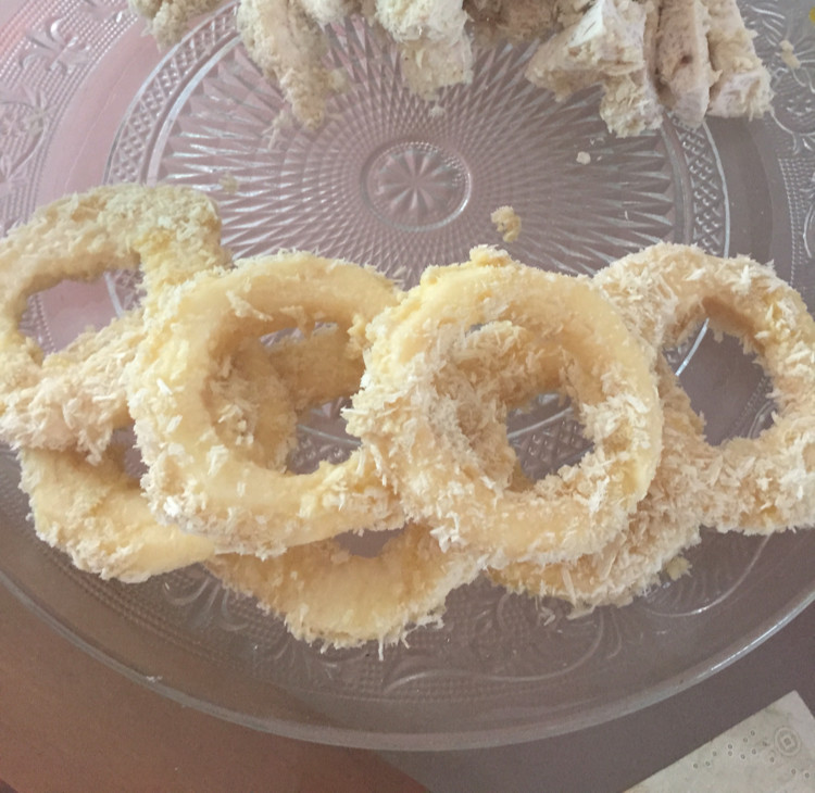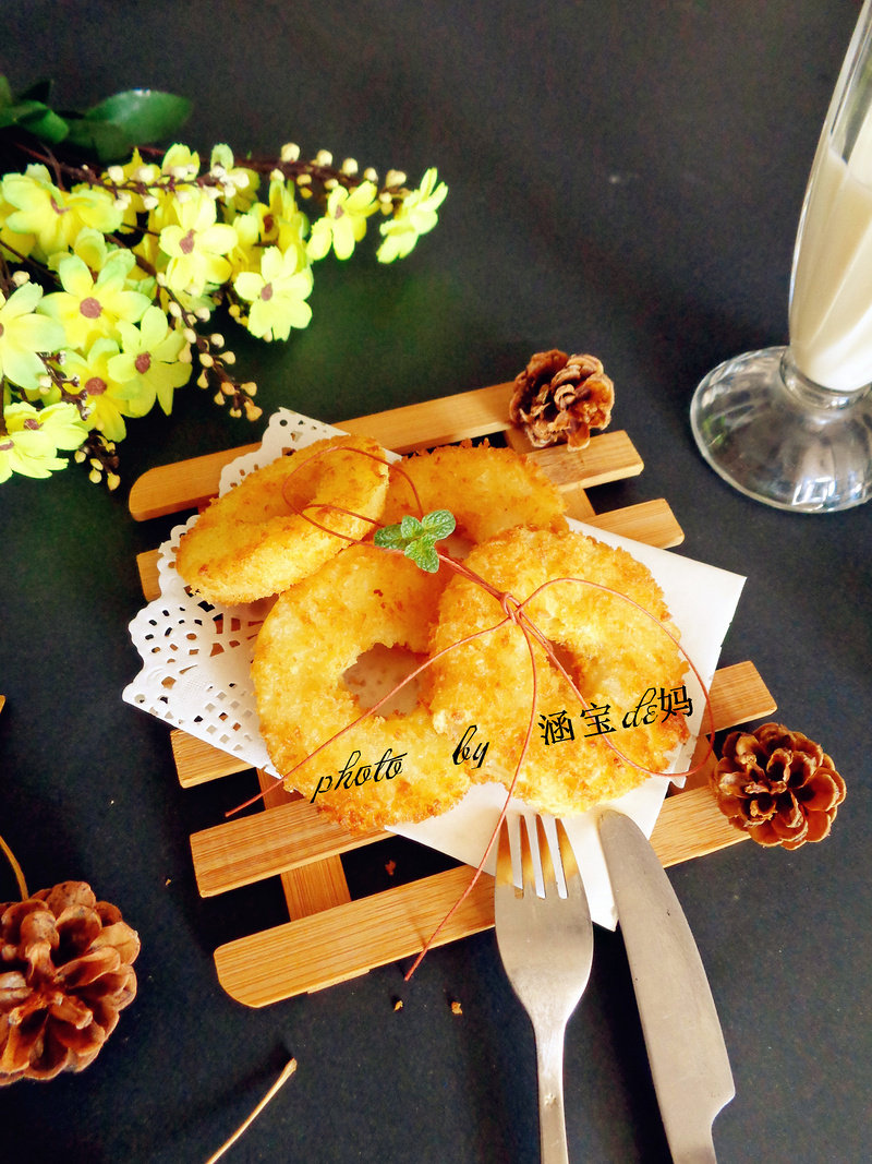 5:先把苹果圈裹上淀粉,然后裹上鸡蛋液,最后裹上面包糠,这个是我儿子裹的,我忘了拍照,就剩最后一个给孩子玩,才想起来,所以看起来不是很好看。。呵呵。