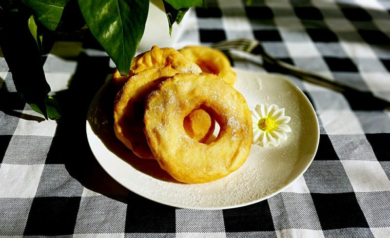 5:锅中加油烧热下入苹果圈炸至两面金黄即可