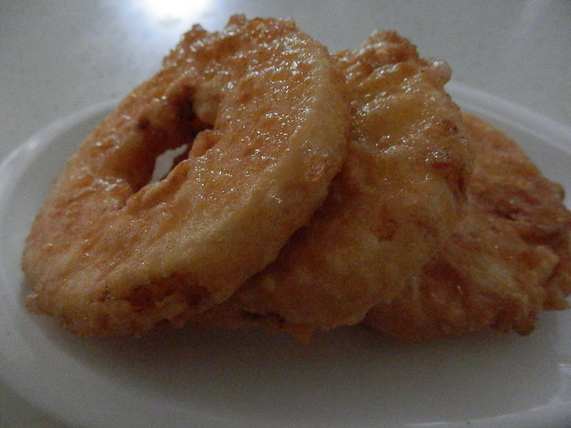 7:油热后放入苹果圈,中小火慢炸,炸至两面金黄即可出锅。