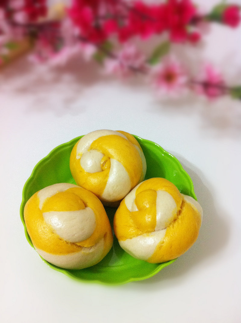 1:南瓜50克蒸熟后捣成泥,加入150克面粉中,面粉中放入20克白糖,1克盐,搅拌均匀,2克酵母用少许温水化开(少许温水即可,因为南瓜泥含的水分很多),酵母水倒入南瓜面粉中,揉成光滑的面团,盖上保鲜膜发酵
