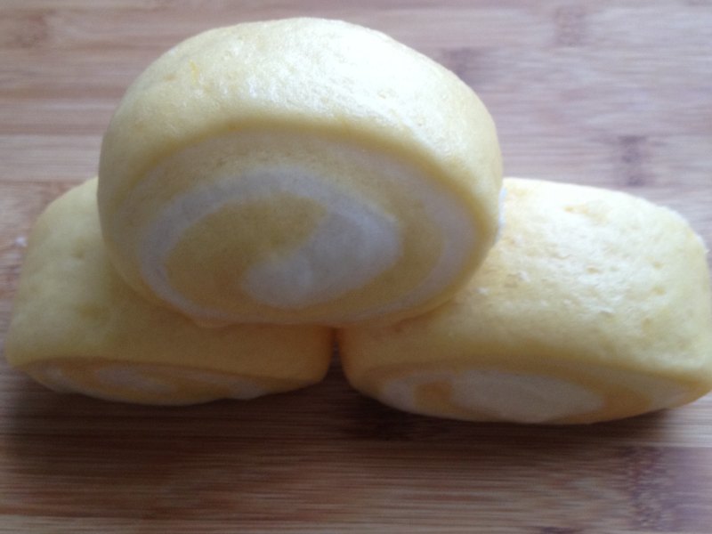 5:发酵好的面团分别取出排气,分别擀成长方形,两个面皮叠在一起,从一头卷起来,成圆柱形,然后切割成大小相同的小剂子
