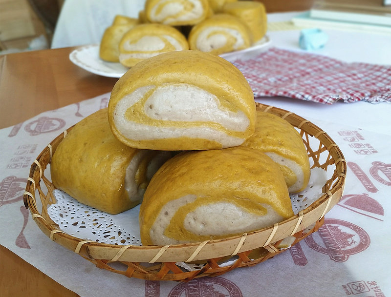 2:将南瓜搅成泥,加酵母、面粉和成面团发,再和一块白面团,发酵至原面团的2倍大。