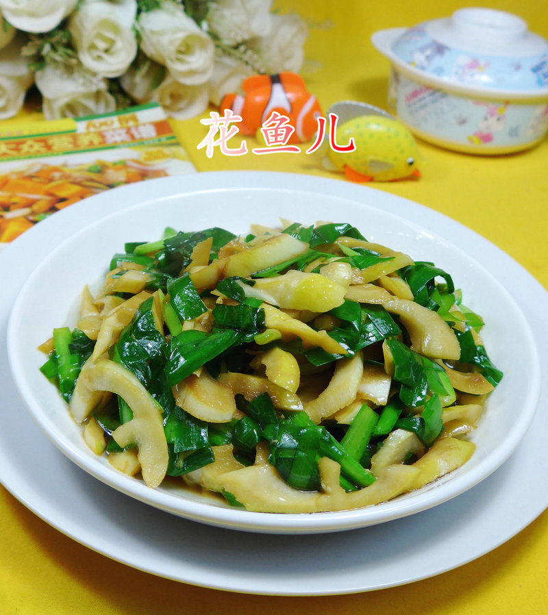 5:烧锅倒油烧热,下入焯好的雷笋和切好的韭菜翻炒翻炒。
