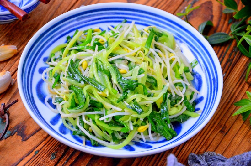 8:美味的豆芽韭菜炒莴笋就做好了。清清爽爽的家常小炒,吃一盘也不会长肉。