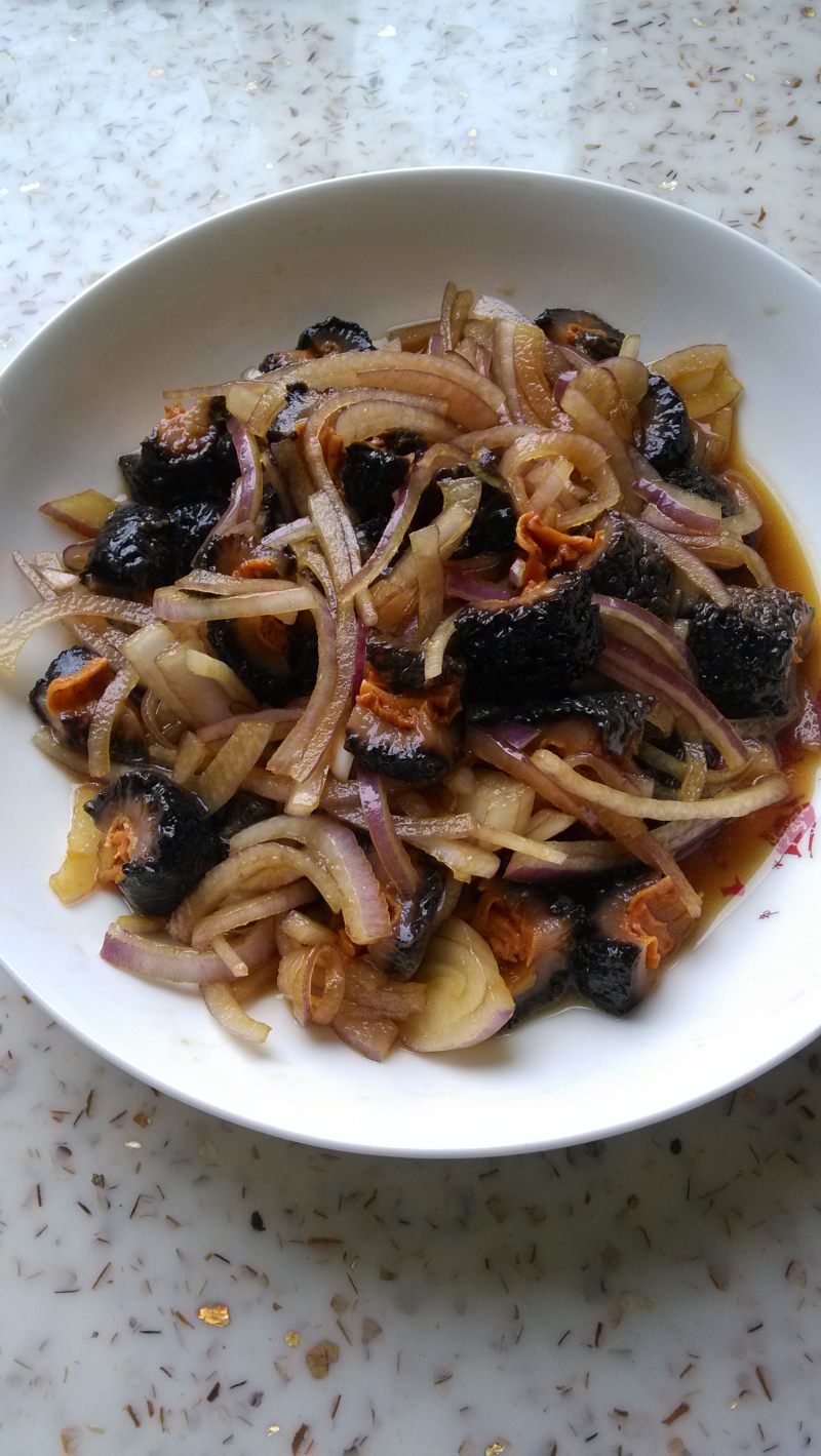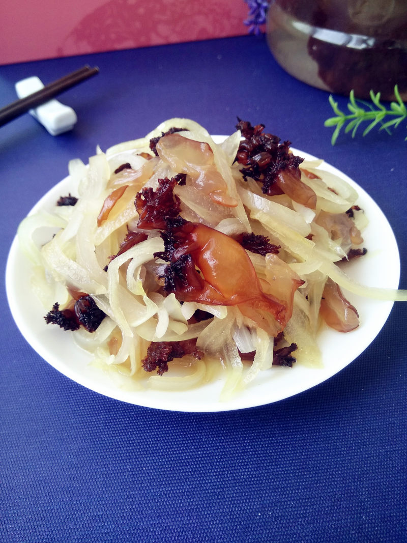 4:海参和洋葱放在一起加酱油,醋,白糖,盐,香油,拌匀即可。