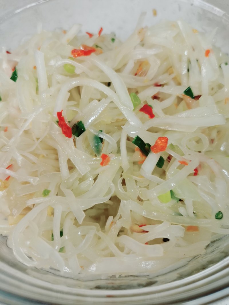 1:菜头忘了拍整个的,去皮切薄片,再切成丝。