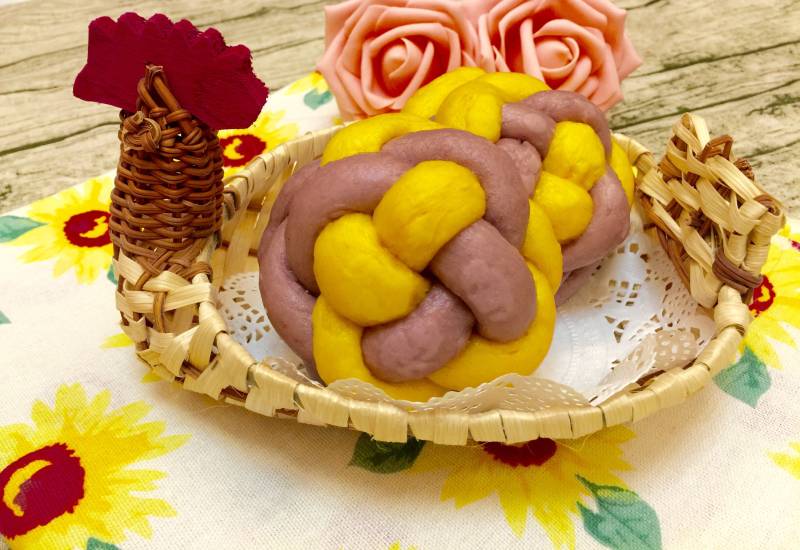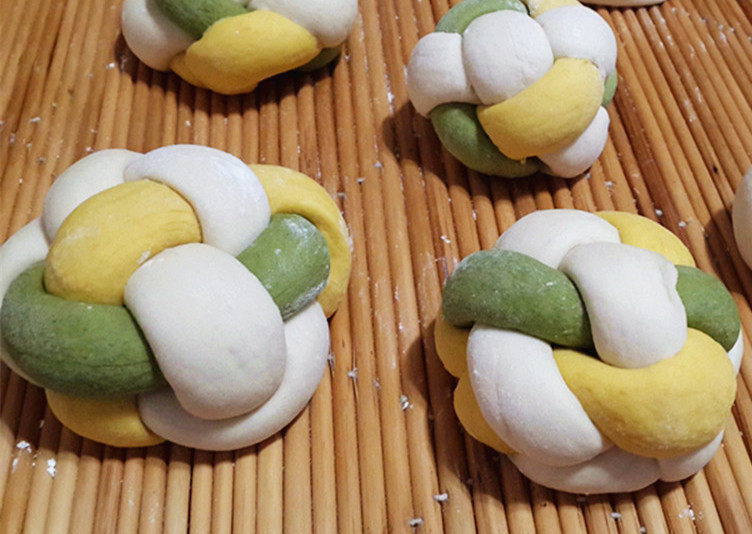 发面团加紫薯、胡罗卜成彩色面团,编出的绣球馒头就是彩色的